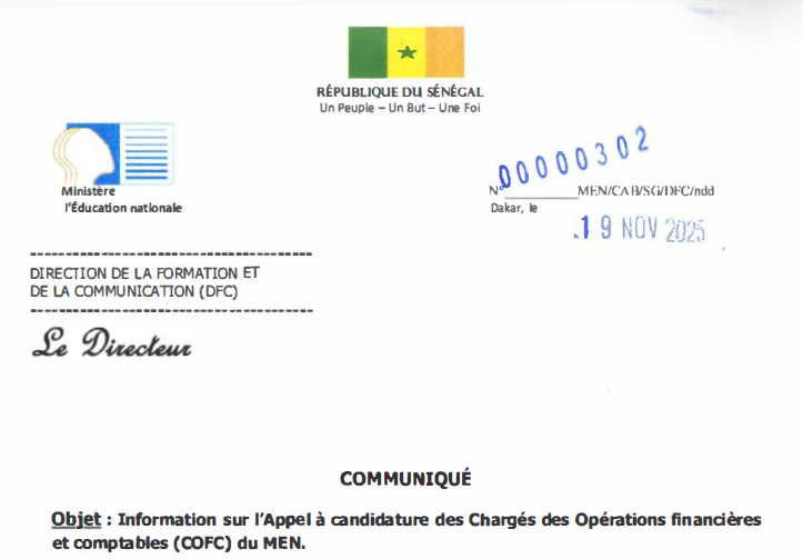 Communiqué : Information sur l'Appel à candidature des Chargés des Opérations financières et comptables (COFC) du MEN.