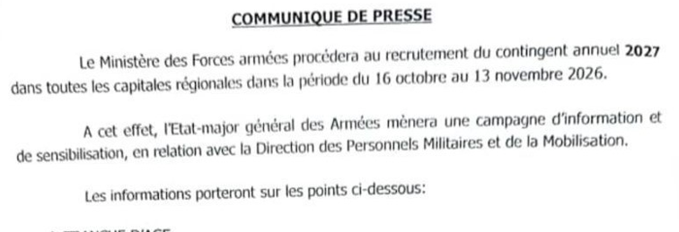 Communiqué de Presse Le Ministère des Forces armées procèdera au recrutement du contingent annuel 2027 dans toutes les capitales régionales [...]